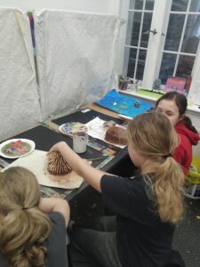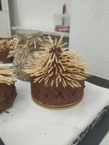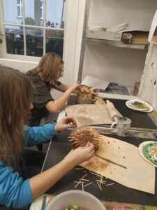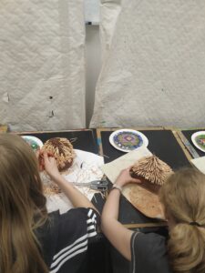 Malowanie na kartonowych „wazach” imitujących ceramikę antyczną. Scena walki Spartan a może coś innego.