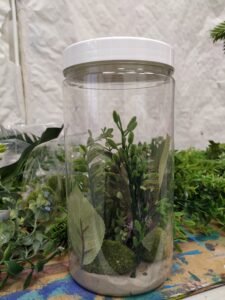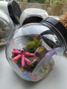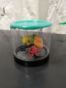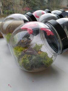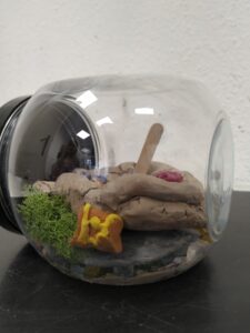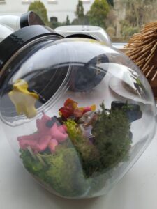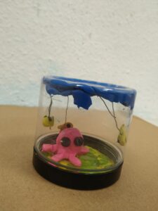 Przezroczysta kula z makietą kolonii wewnątrz.